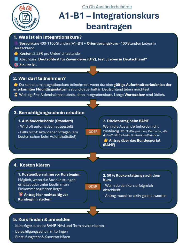 - Ausländerbehörde: Die Ausländerbehörde stellt den sogenannten Berechtigungsschein aus, der zur Teilnahme am Integrationskurs berechtigt.