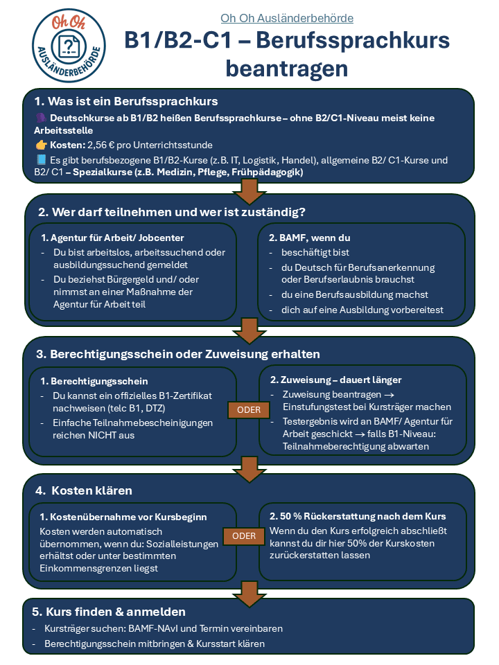 Berufssprachkurse sind nicht das Gleiche wie andere Intensiv-Deutschkurse. Für die Teilnahme braucht ihr eine Teilnahmeberechtigung oder eine Zuweisung, die euch entweder das BAMF oder die Agentur für Arbeit bzw. das Jobcenter ausstellt. Die Agentur für Arbeit bleibt oft die erste Ansprechperson. Die verschiedenen verfügbaren Berufssprachkurse kannst du hier einsehen: Berufssprachkurse | Sprachförderung | Bundesagentur für Arbeit